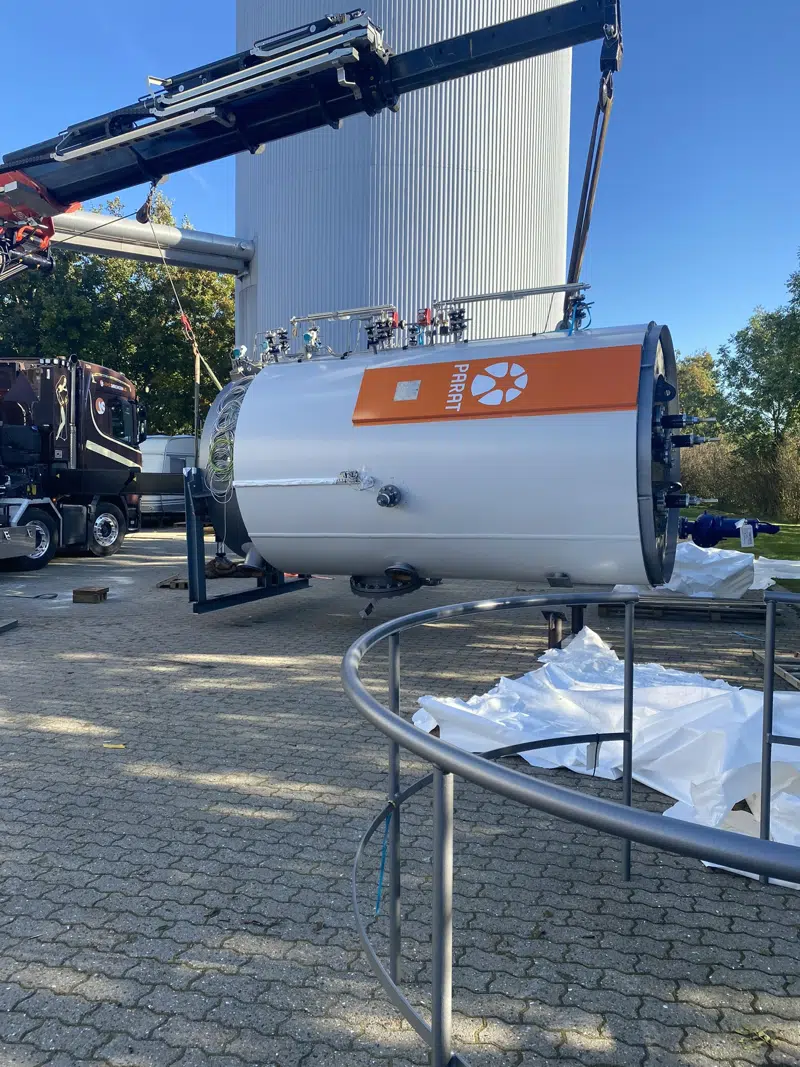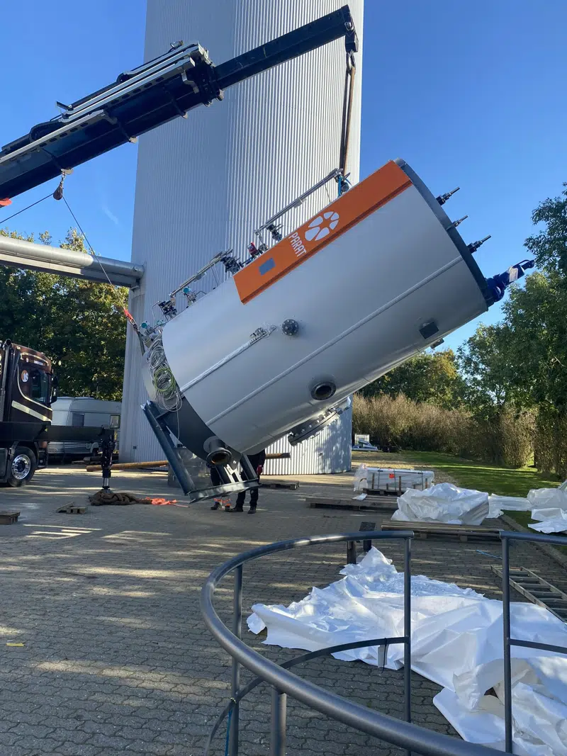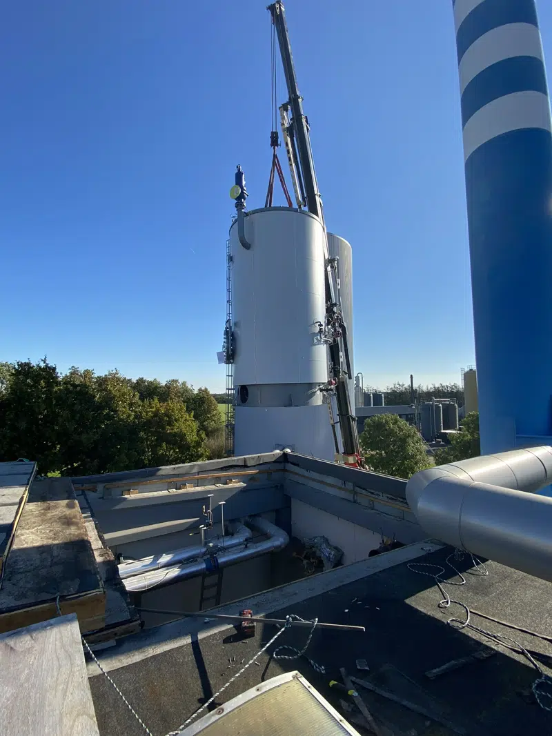 Den 1. oktober blev elkedlen løftet på plads gennem taget, og det var et imponerende syn. Siden da har arbejdet med installation og tilslutning stået på, og vi nærmer os nu slutspurten. Hvis alt går som planlagt, forventer vi at kunne sætte elkedlen i drift sidst i december.