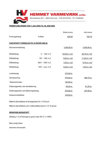 TARIFBLAD Hemmet Varmeværk 2024 25