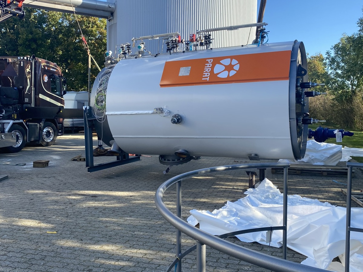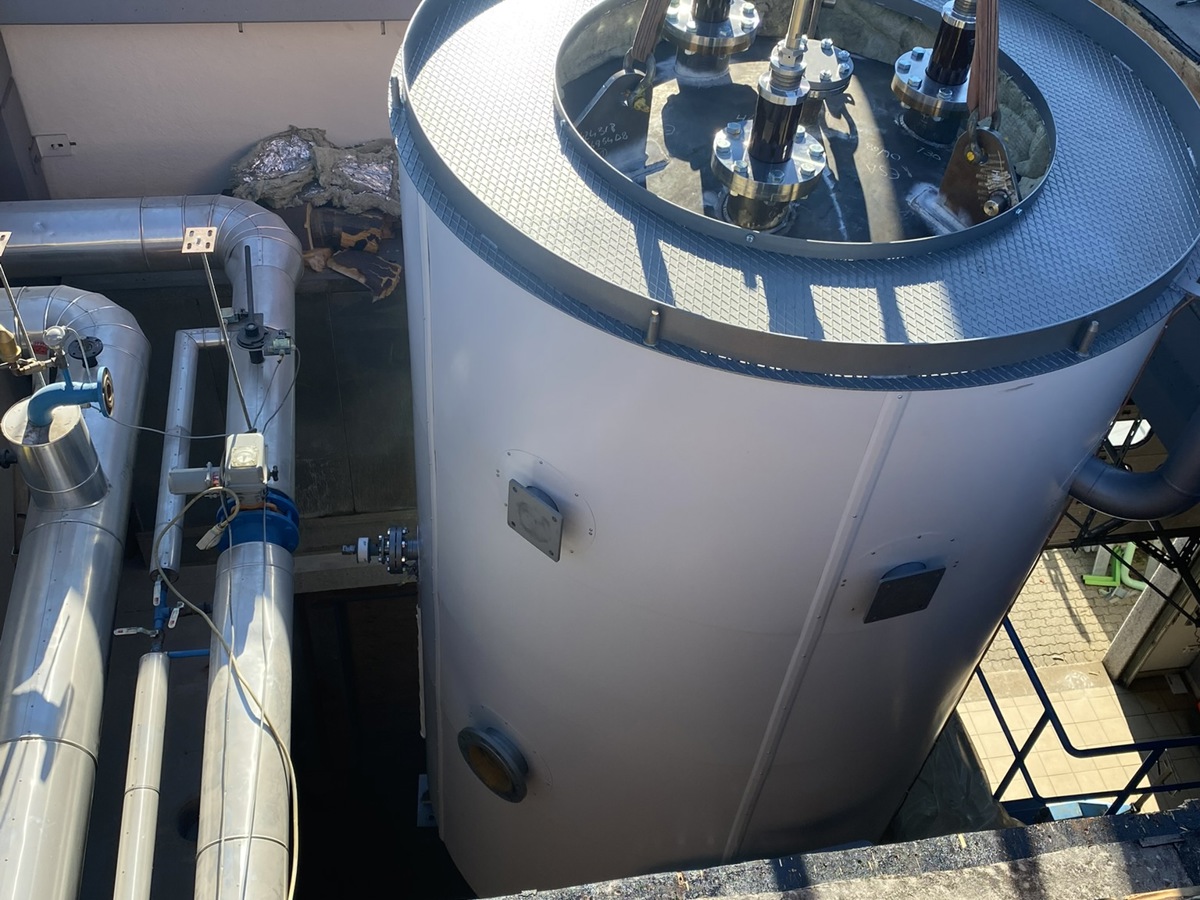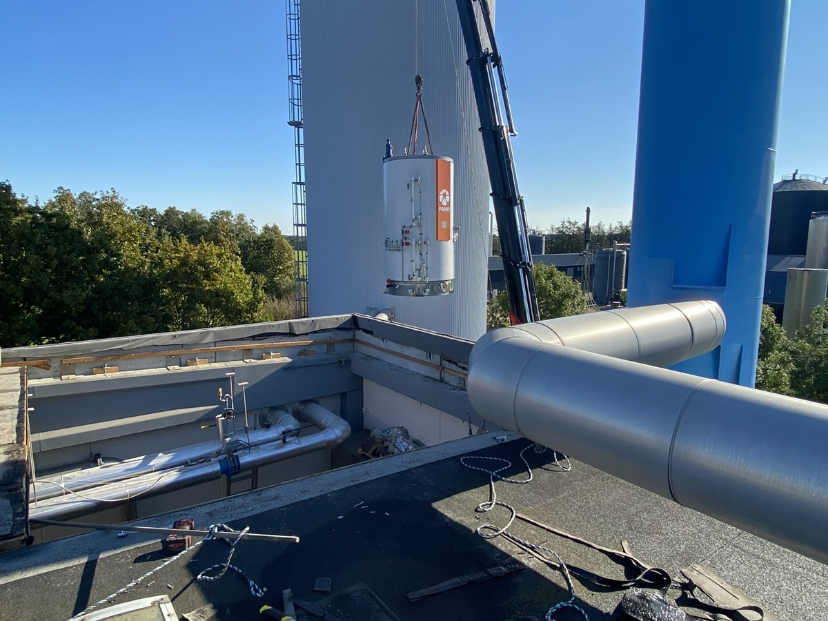 Den 1. oktober blev elkedlen løftet på plads gennem taget, og det var et imponerende syn. Siden da har arbejdet med installation og tilslutning stået på, og vi nærmer os nu slutspurten. Hvis alt går som planlagt, forventer vi at kunne sætte elkedlen i drift sidst i december.